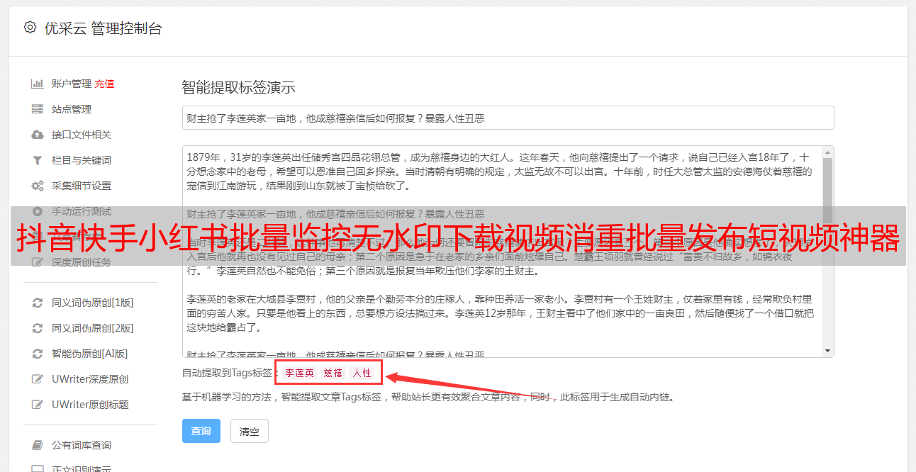 优采云 发布时间: 2022-07-01 22:41抖音快手小红书批量监控无水印下载视频消重批量发布短视频神器2.0