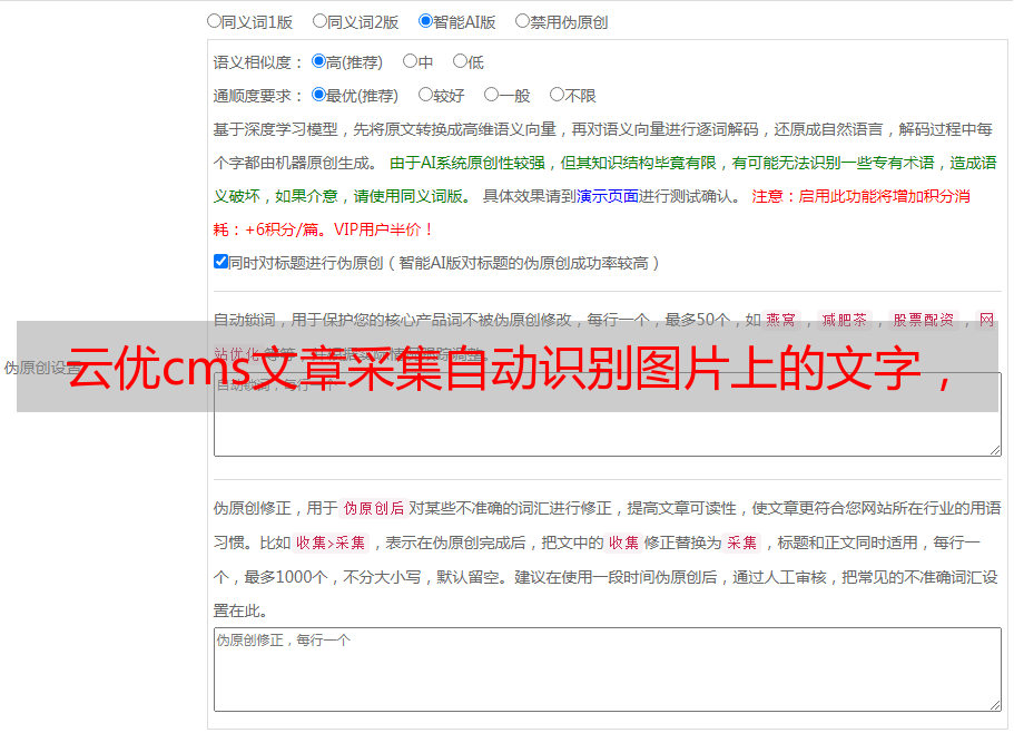 云优cms文章采集自动识别图片上的文字,包括文字、图片和链接等。云优cms文章采集系统为您提供免费技术咨询服务,