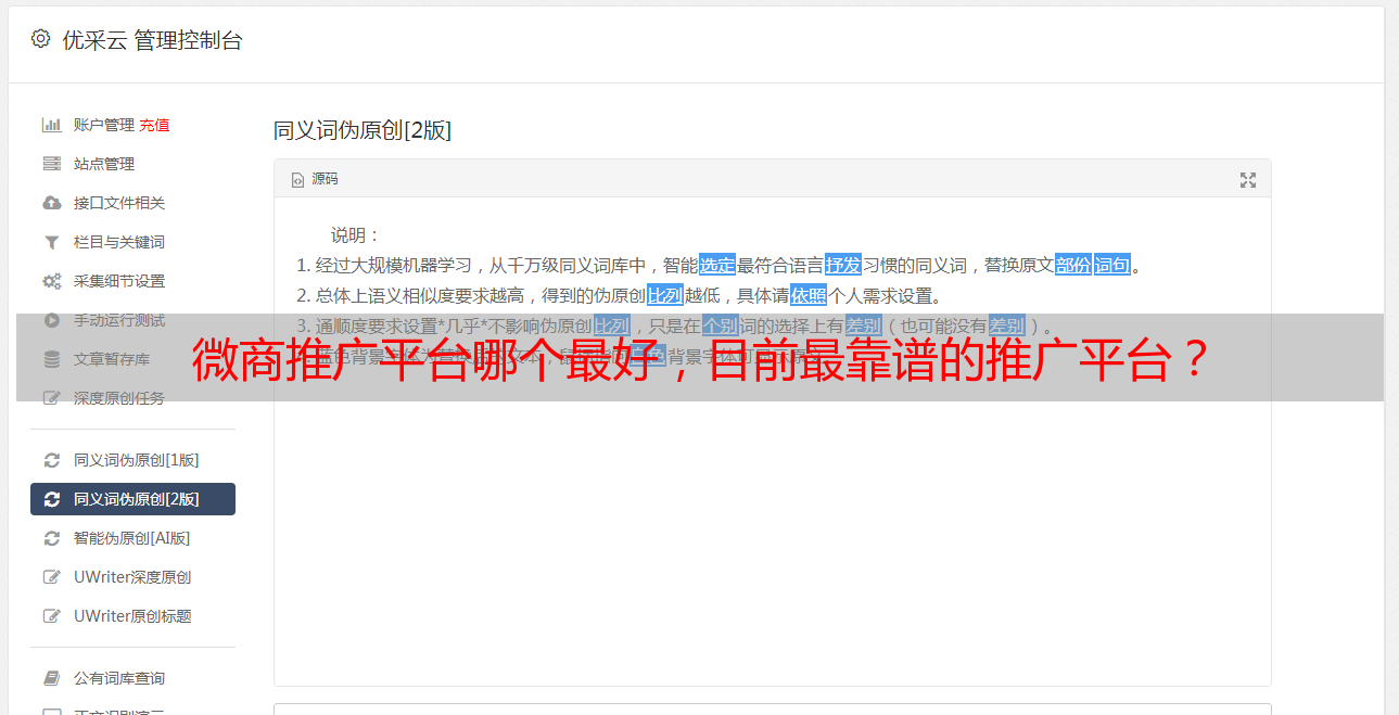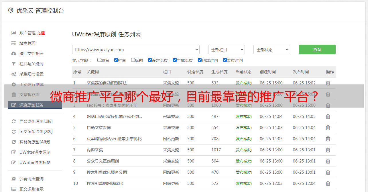 网站推广SEO软件不仅具有采集功能,全网CMS发布功能支持各类开源CMS发布,发布后自动推送搜索引擎平台,发布前还支持批量SEO管理,通过关键词插入、同义词替换、敏感词删除等对我们的文本进行处理,还可以通过云存储对采集的图片进行处理,实现高度原创。