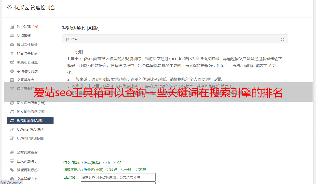 优采云 发布时间: 2022-07-25 02:02爱站seo工具箱可以查询一些关键词在搜索引擎的排名