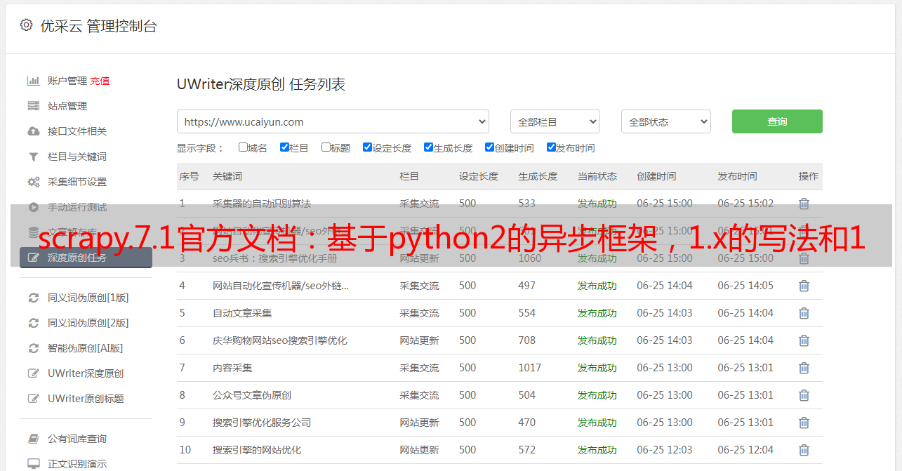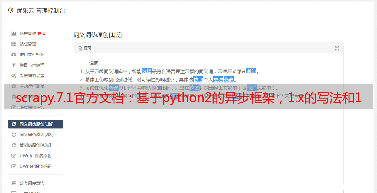 优采云 发布时间: 2022-07-27 16:04scrapy.7.1官方文档:基于python2的异步框架,1.x的写法和1