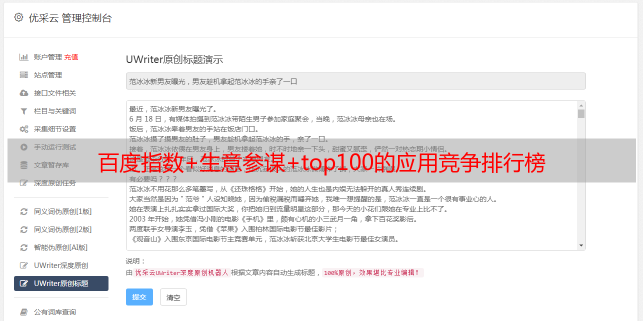 优采云 发布时间: 2022-07-29 04:10百度指数+生意参谋+top100的应用竞争排行榜