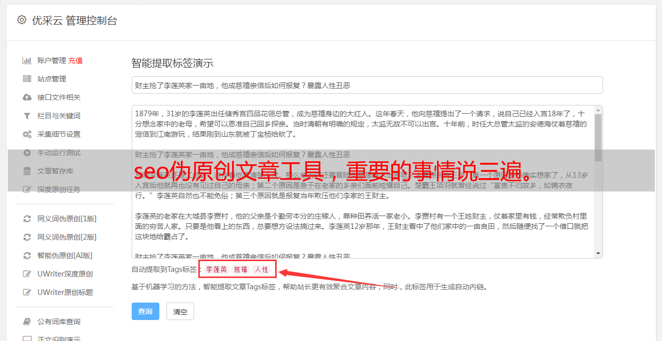 优采云 发布时间: 2022-08-06 16:04seo伪原创文章工具,重要的事情说三遍。
