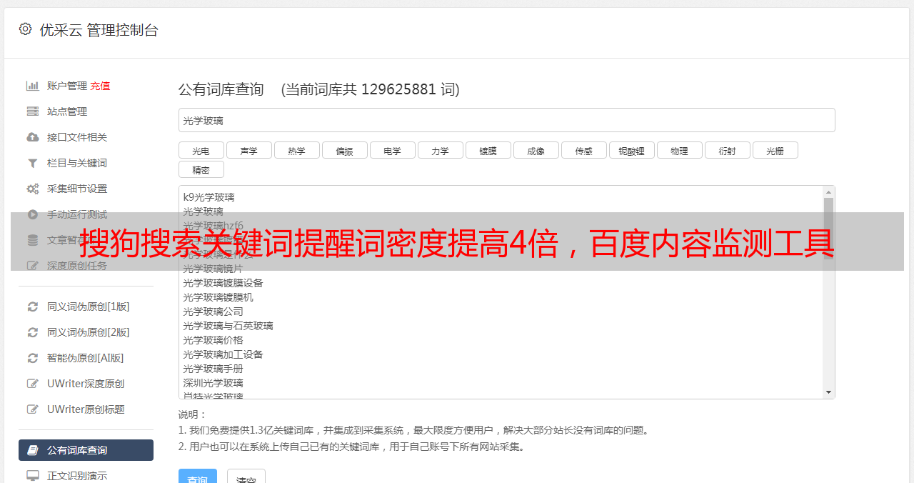 优采云 发布时间: 2022-08-24 23:05搜狗搜索关键词提醒词密度提高4倍,百度内容监测工具