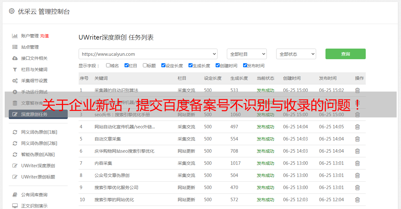优采云 发布时间: 2022-08-26 02:02关于企业新站,提交百度备案号不识别与收录的问题!