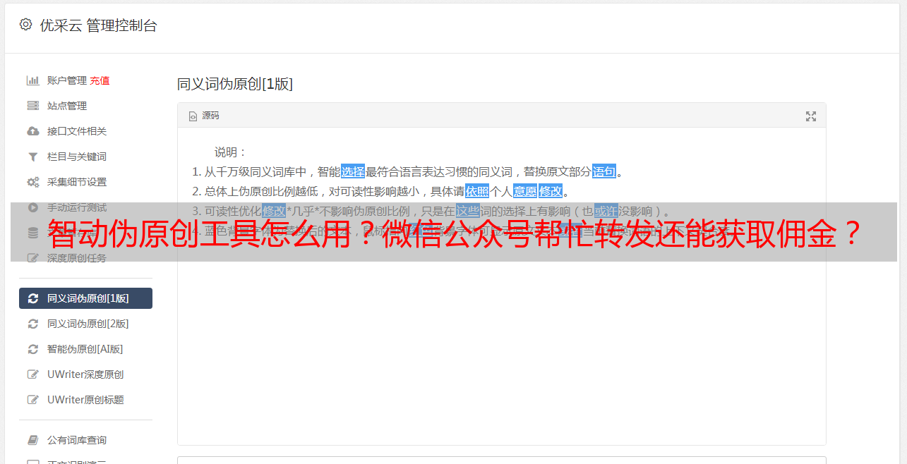 优采云 发布时间: 2022-08-27 10:03智动伪原创工具怎么用?微信公众号帮忙转发还能获取佣金?