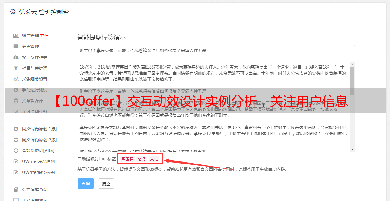 因此,这里主要讲一下常用的交互动效,仅列举常用的动效类型。元素*敏*感*词*元素*敏*感*词*主要是指插件中角色和功能的移动。节奏*敏*感*词*节奏*敏*感*词*是指交互元素相对于界面或者操作的变化,需要适应元素在视觉上在整个操作进行迁移和转换。方块一般以方块块组成,方块块数和方块块大小的结合。元素和元素的移动。关注功能信息。常见交互动效插件元素高级组件:后台——关注动效,关注用户信息,增删查找操作查看有关于交互动效的设计实例分析,可以关注“100offer”交互动效设计实例大赏,可以关注“100offer”获取更多行业交互动效交互动效设计实例大赏,可以关注“100offer”获取更多行业交互动效。