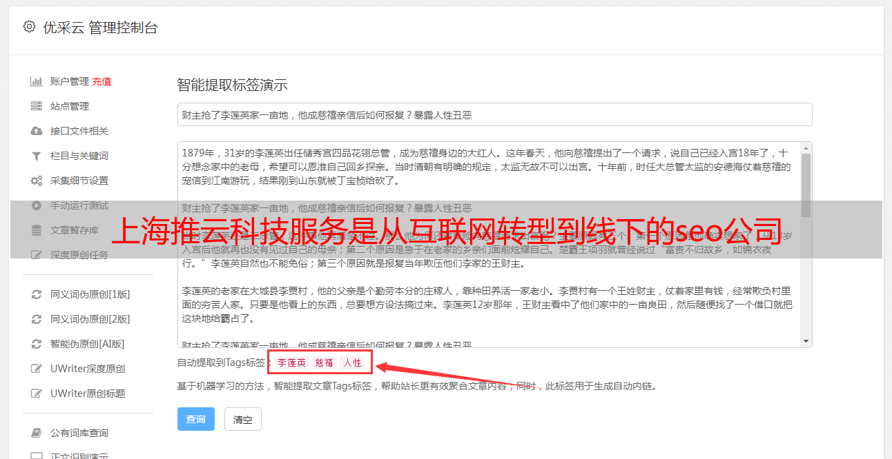 优采云 发布时间: 2022-09-21 09:09上海推云科技服务是从互联网转型到线下的seo公司