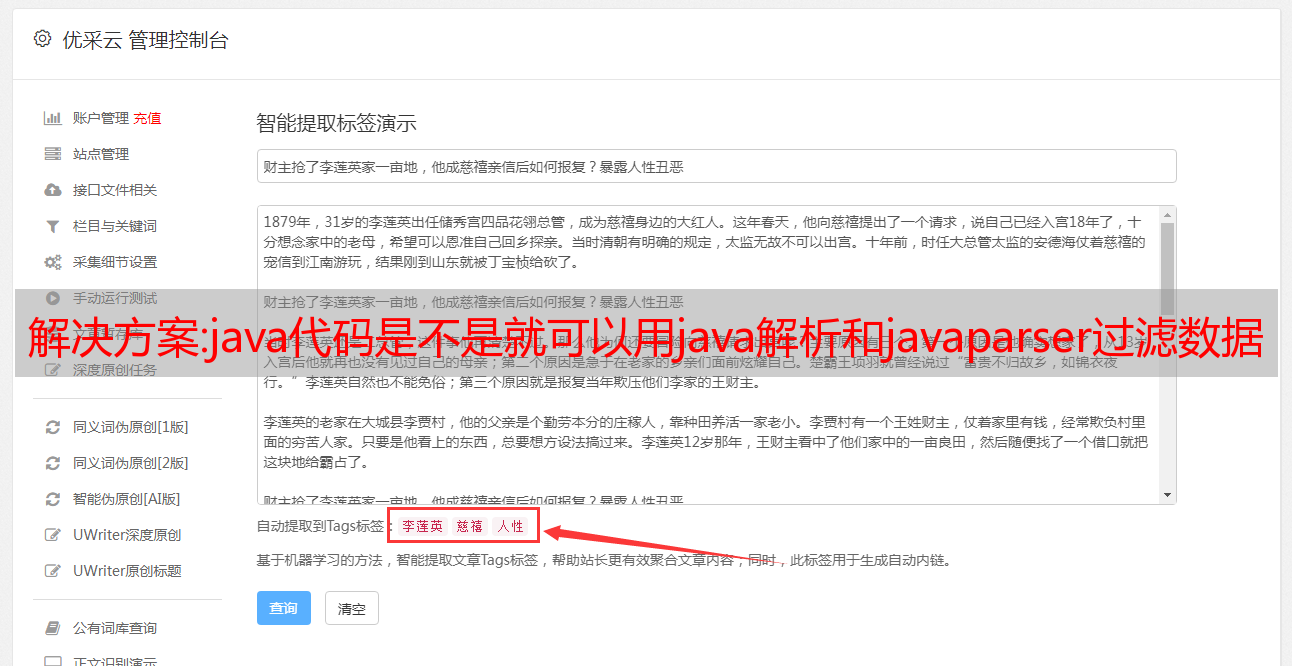 优采云 发布时间: 2022-09-22 01:05解决方案:java代码是不是就可以用java解析和javaparser过滤数据