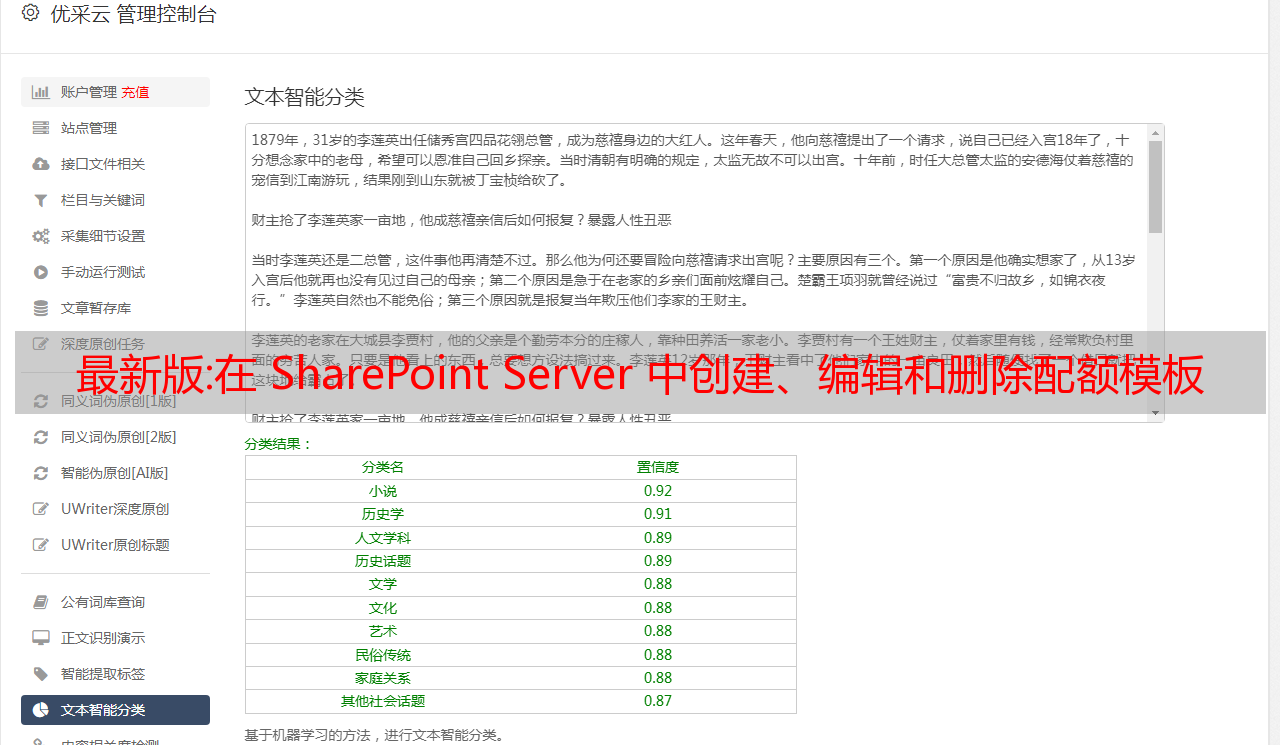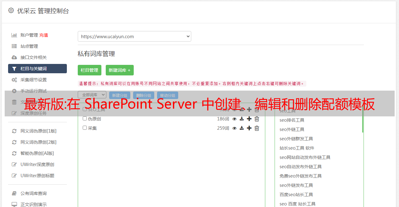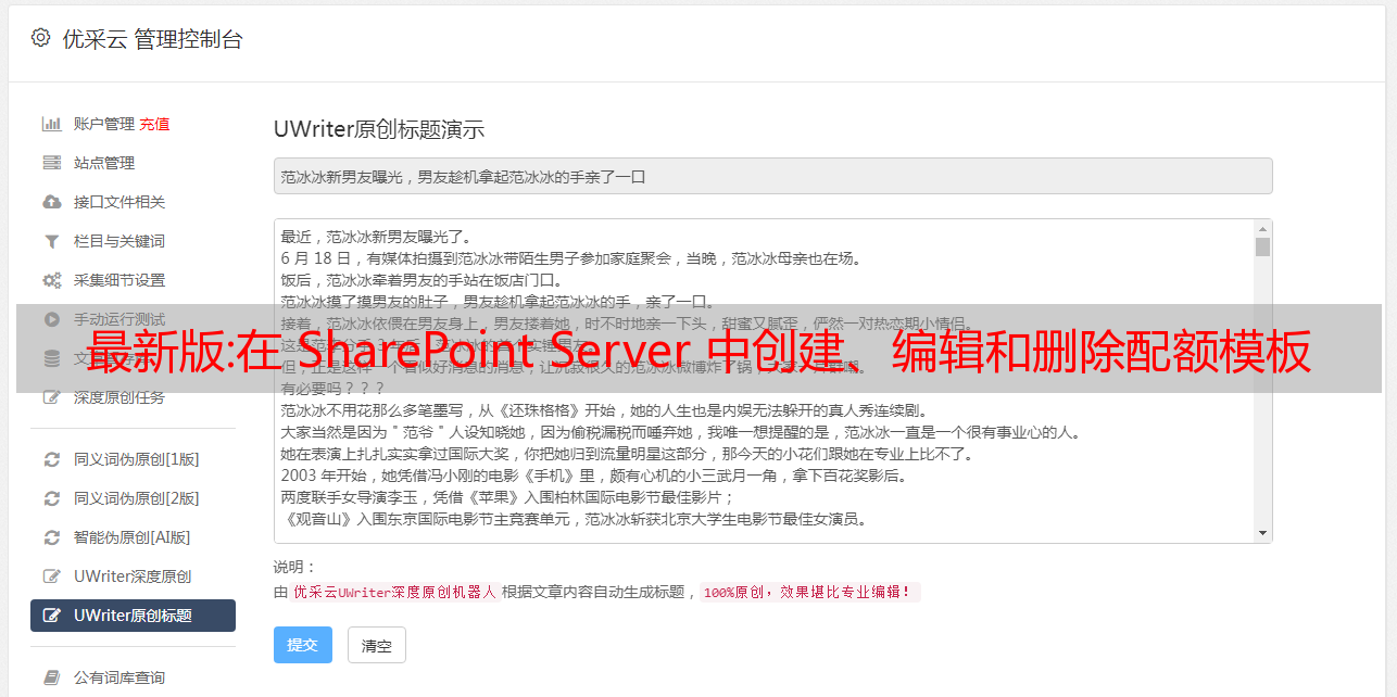 优采云 发布时间: 2022-09-22 11:11最新版:在 SharePoint Server 中创建、编辑和删除配额模板