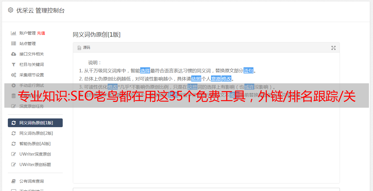 优采云 发布时间: 2022-09-23 14:14专业知识:SEO老鸟都在用这35个免费工具,外链/排名跟踪/关键词研究/内容营销等5类