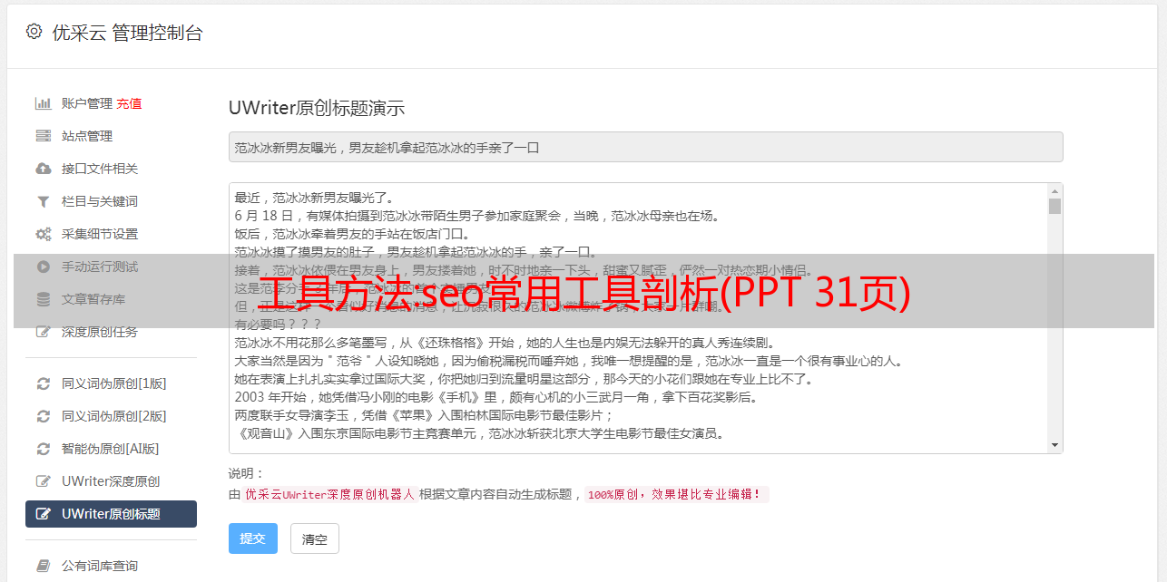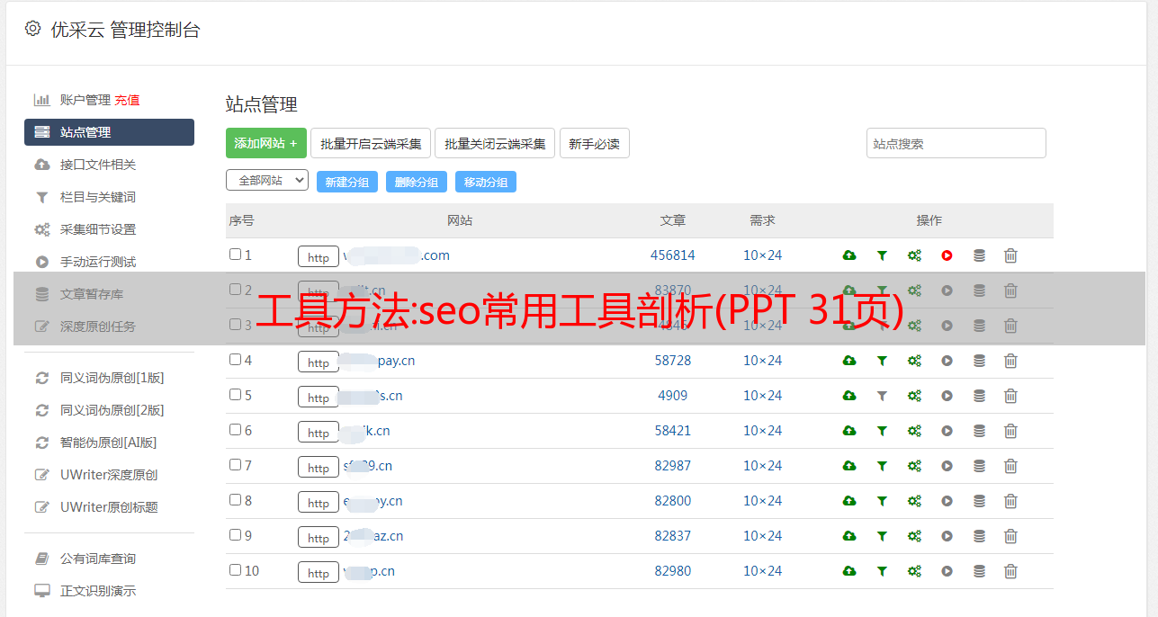 优采云 发布时间: 2022-09-25 22:12工具方法:seo常用工具剖析(PPT 31页)