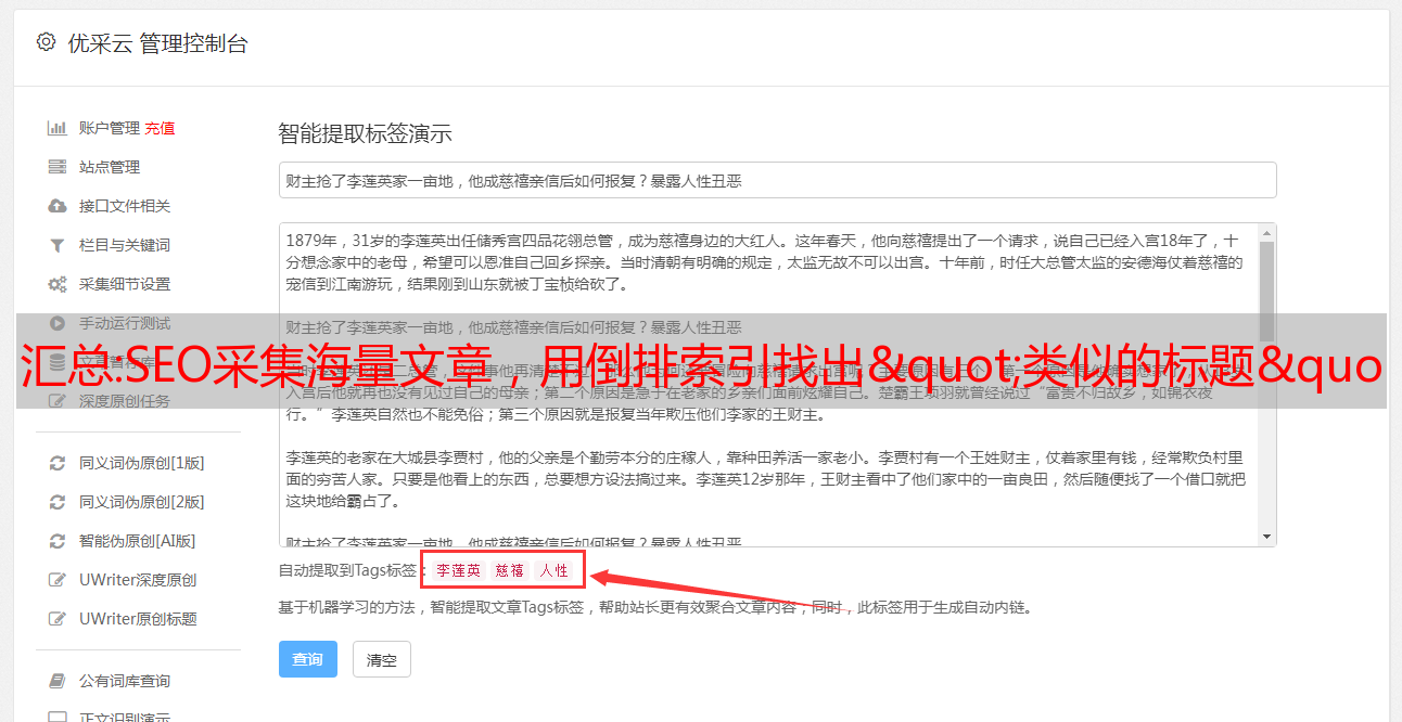 自动标题、段落生成、自动内链、内容过滤、URL过滤、同义词替换等多种方法增强采集文章原创和改进搜索引擎收录 、网站权重和关键词排名。