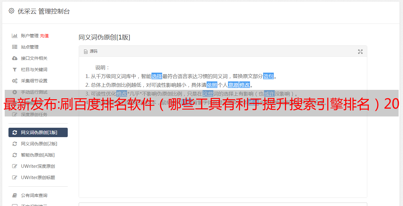这是一本专门分析网站主要关键词,挖掘长尾关键词、热门关键词和行业关键词的大型同义词词典。它也是扩大SEO优化人员和优化百度排名的工具之一。