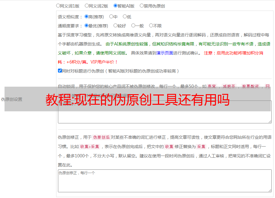 伪原创工具完全没用,对SEO没有任何帮助,有的只是对用户体验的伤害,长期使用伪原创工具反而会让自己丧失创新能力,使用伪原创工具是对搜索引擎的不尊重,对用户的不尊重。