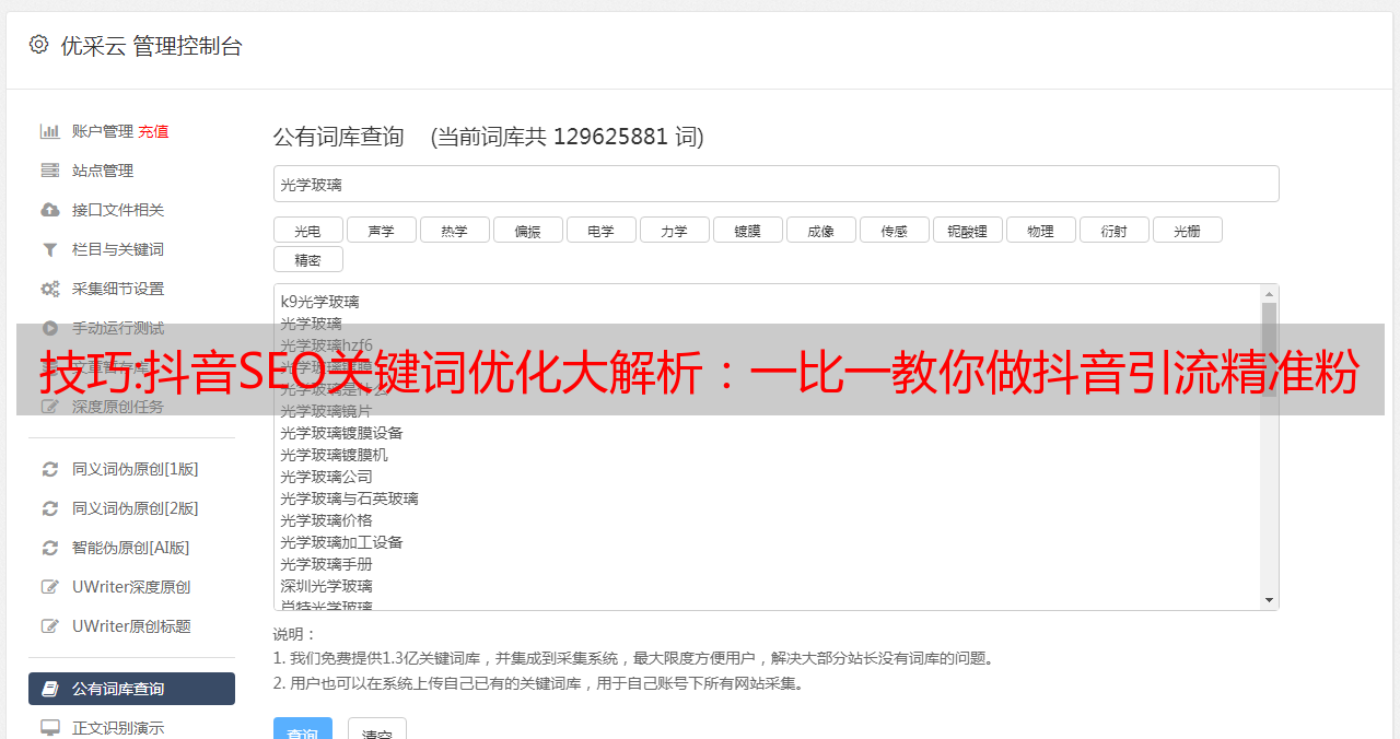 优采云 发布时间: 2022-09-30 20:10技巧:抖音SEO关键词优化大解析:一比一教你做抖音引流精准粉,价值巨大1小时后删!