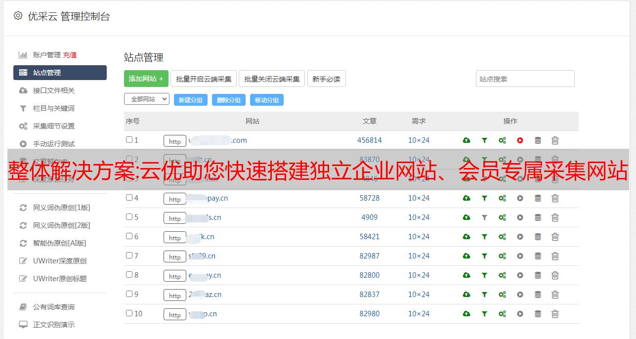整体解决方案:云优助您快速搭建独立企业网站、会员专属采集网站