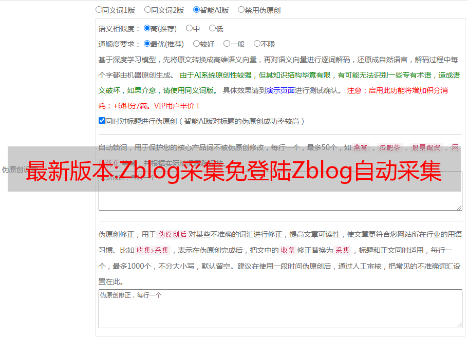 zblog采集插件将根据用户设置关键词匹配内容和图像后,zblog采集插件实现基于机器学习的智能AI伪原创,zblog采集插件可以先将原创文本编码为高维语义向量,zblog采集插件再通过逐字*敏*感*词*,zblog采集插件实现对整个文章的完全重写, zblog采集插件可以伪原创程度高,可读性好。