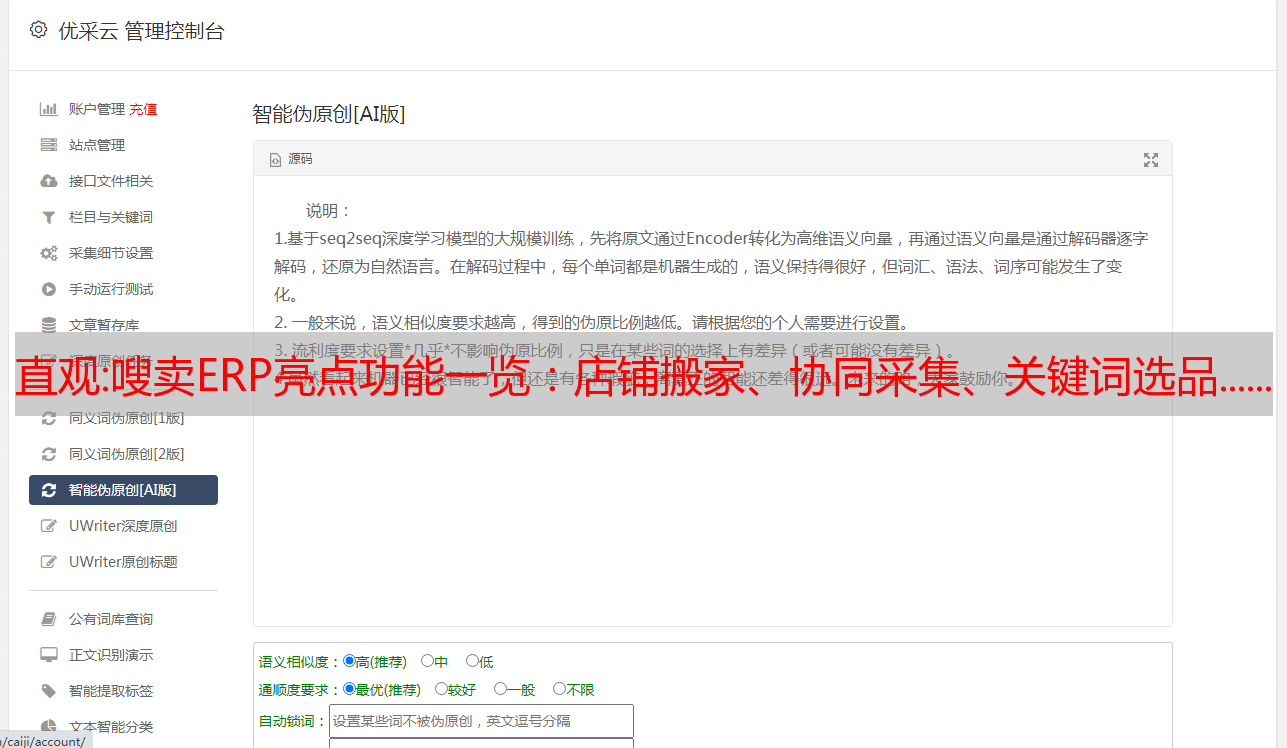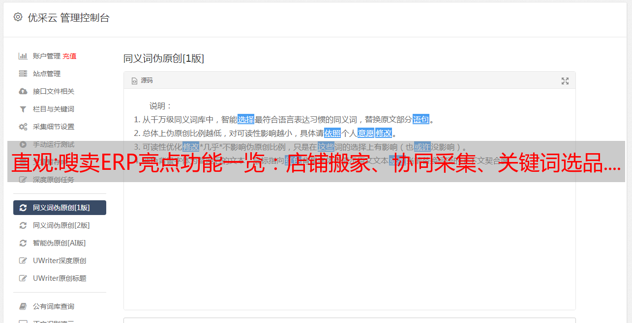 优采云 发布时间: 2022-10-06 11:19直观:嗖卖ERP亮点功能一览:店铺搬家、协同采集、关键词选品......