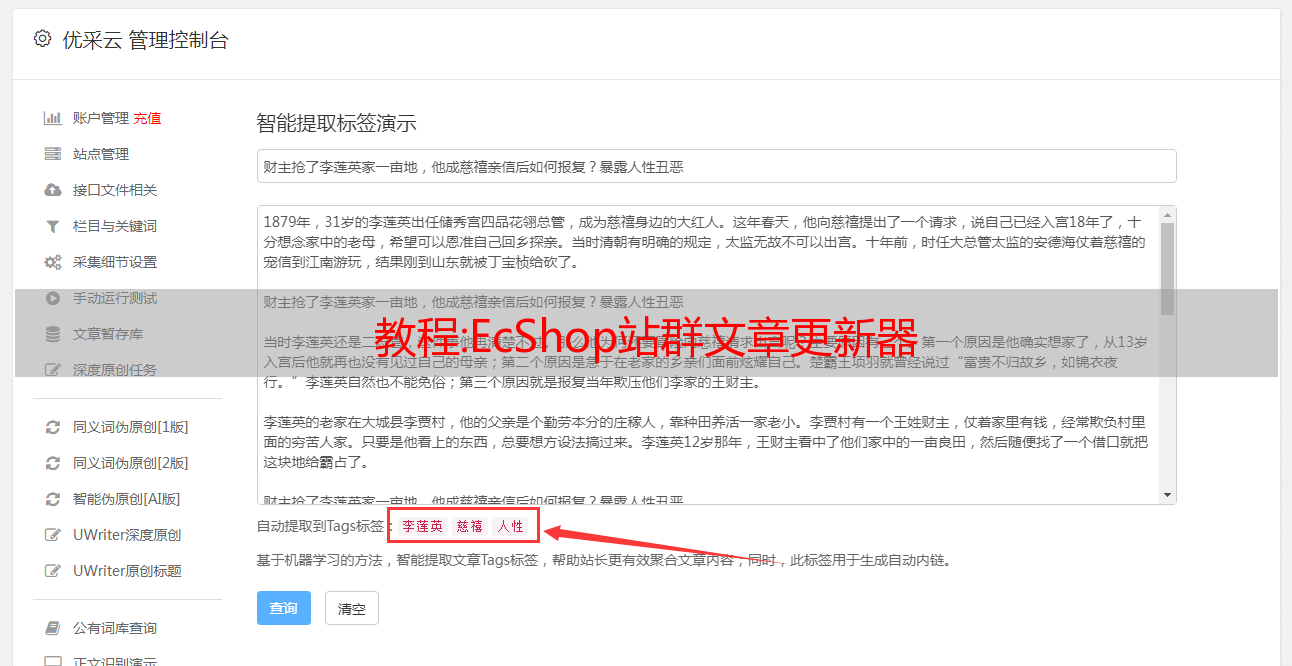 优采云 发布时间: 2022-10-08 10:33教程:EcShop站群文章更新器