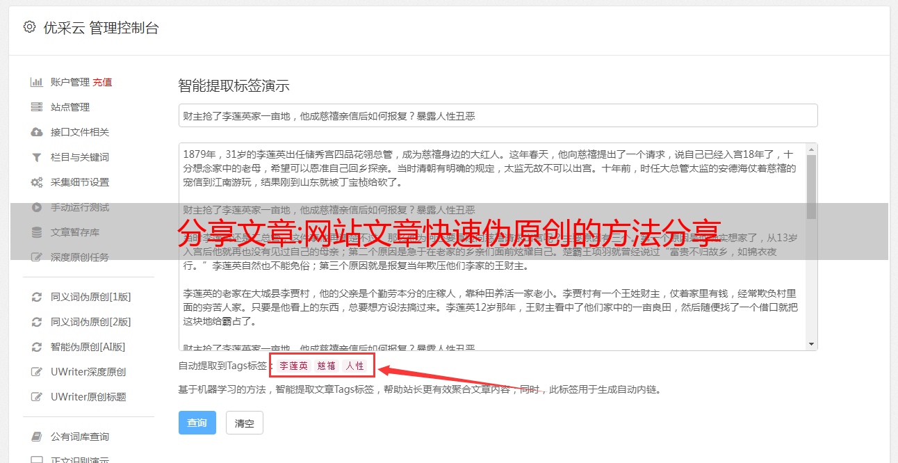 伪原创软件一般都有词库管理,方便用户根据自己的需要进行组织编辑,还支持批量伪原创,繁简一键转换,非常方便并且易于使用。这里不得不给大家介绍一款可以检测伪原创文章和文章原创度数的软件:优采云。优采云AI是基于几项SEO原理、分词科学、自然语言包装技术等,使用文本辅助软件结合大部分文字处理技术。在程序中使用手动自定义操作和特殊算法,在短时间内联合生成文章,10篇,100篇,甚至1000篇。纯原创文章,