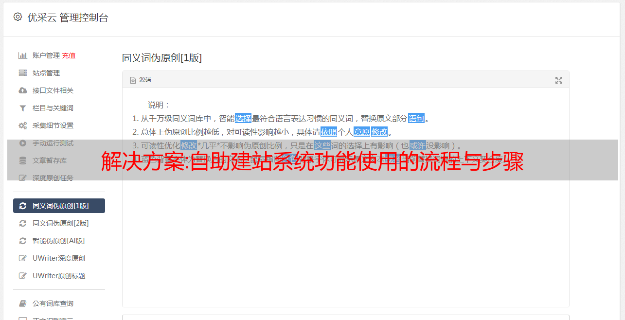 优采云 发布时间: 2022-10-10 03:05解决方案:自助建站系统功能使用的流程与步骤