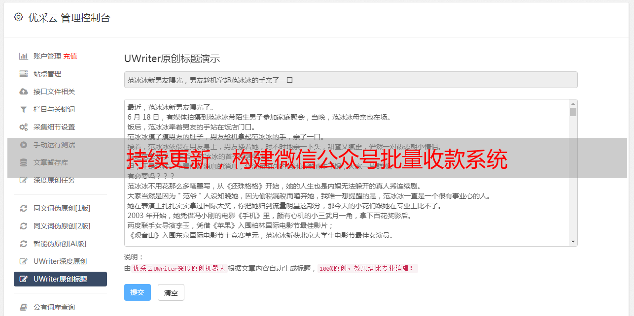 优采云 发布时间: 2020-08-07 06:20自2014年以来,我一直在批量采集微信官方帐户的内容. 最初的目的是建立一个html5垃圾邮件网站. 当时,垃圾站采集到的微信公众号的内容很容易在该公众号中传播. 当时,批量采集特别容易进行,并且采集条目是官方帐户的历史新闻页面. 现在这个入口是一样的,但是采集起来越来越难了. 采集方法也已在许多版本中更新. 后来,在2015年,html5垃圾站没有这样做. 取而代之的是将采集目标定位在本地新闻信息公共帐户上,并将前端显示制作成应用程序. 这样就形成了一个新闻应用程序,它可以自动采集官方帐户的内容. 我曾经担心微信技术升级后的一天,我将无法采集内容,而我的新闻应用程序也会失败. 但是随着微信技术的不断升级,收款方式也有了升级,这使我越来越有信心. 只要存在官方帐户历史记录页面,就可以分批采集内容. 因此,今天我决定整理采集方法并写下来. 我的方法来自许多同事的共享精神,因此我将继续这种精神并分享我的结果.