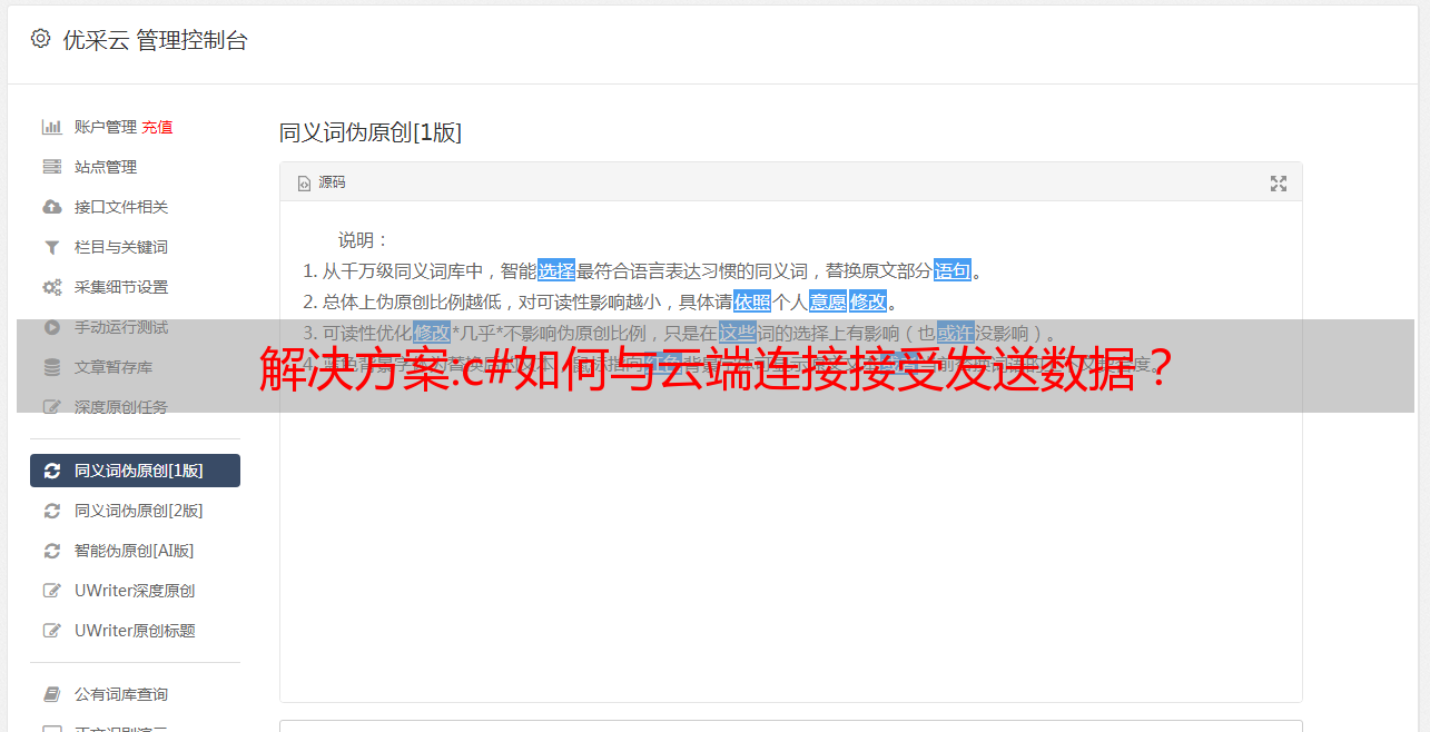 优采云 发布时间: 2022-10-17 05:30解决方案:c#如何与云端连接接受发送数据?