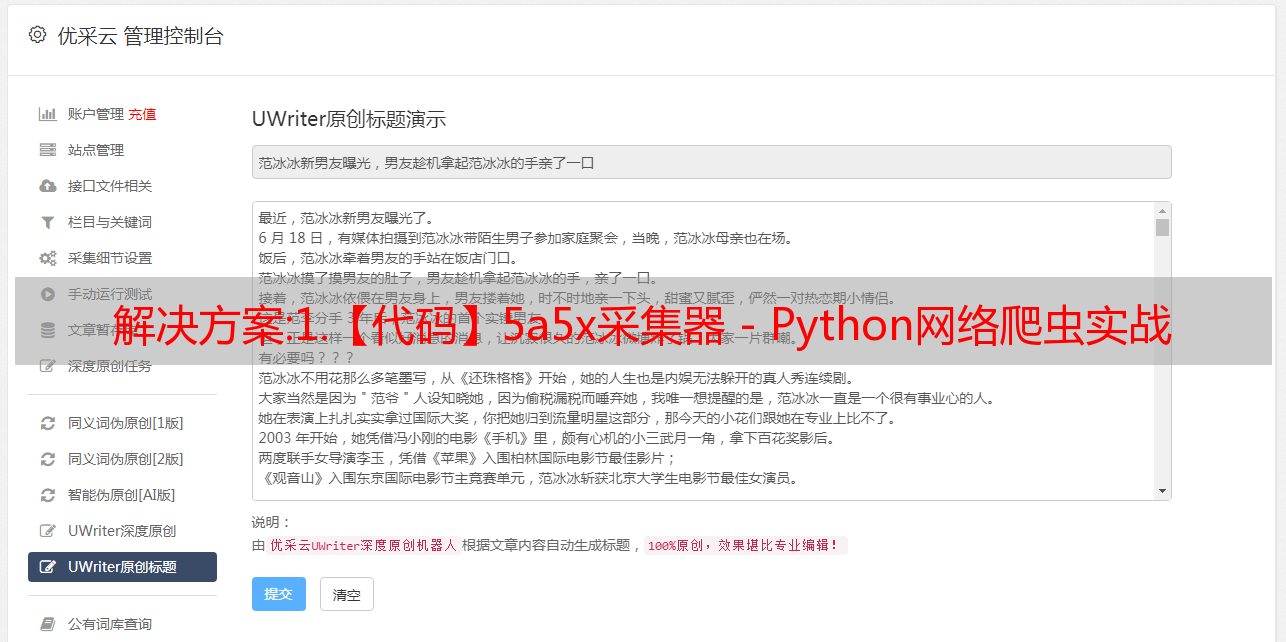 优采云 发布时间: 2022-10-17 20:29解决方案:1.【代码】5a5x采集器 - Python网络爬虫实战
