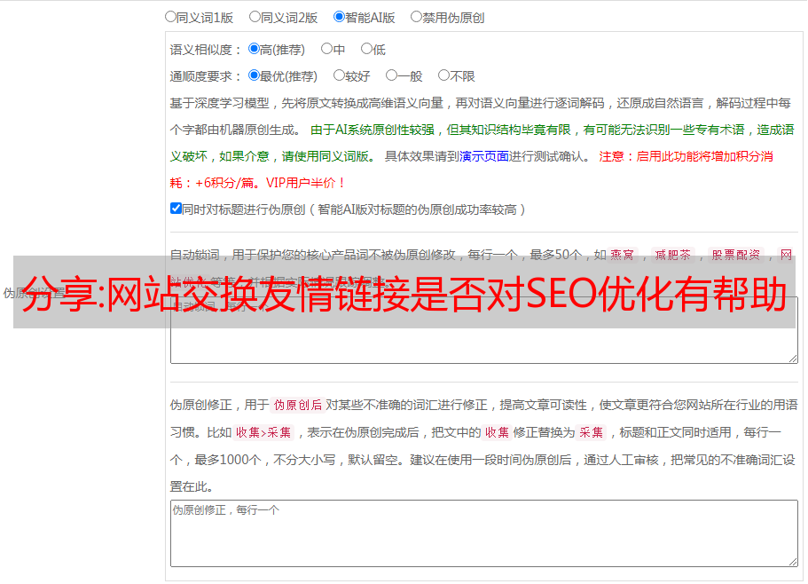 6.相关性优化(关键词出现在正文中,正文第一段会自动插入到title标题中,当描述相关性较低时,会自动添加当前采集的关键词 . 当前采集的关键字在文本单词中随机位置自动插入两次,当当前采集的关键词出现在文本中时,关键词会自动加粗。)