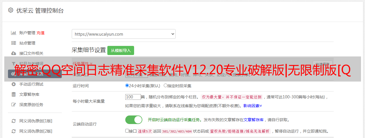 优采云采集定时采集+SEO+第三方伪原创接口+自动发布全链。
