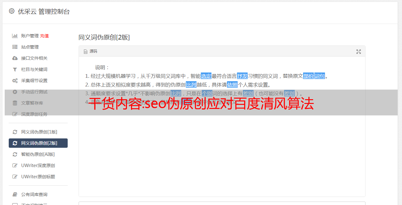 优采云 发布时间: 2022-10-22 18:44干货内容:seo伪原创应对百度清风算法