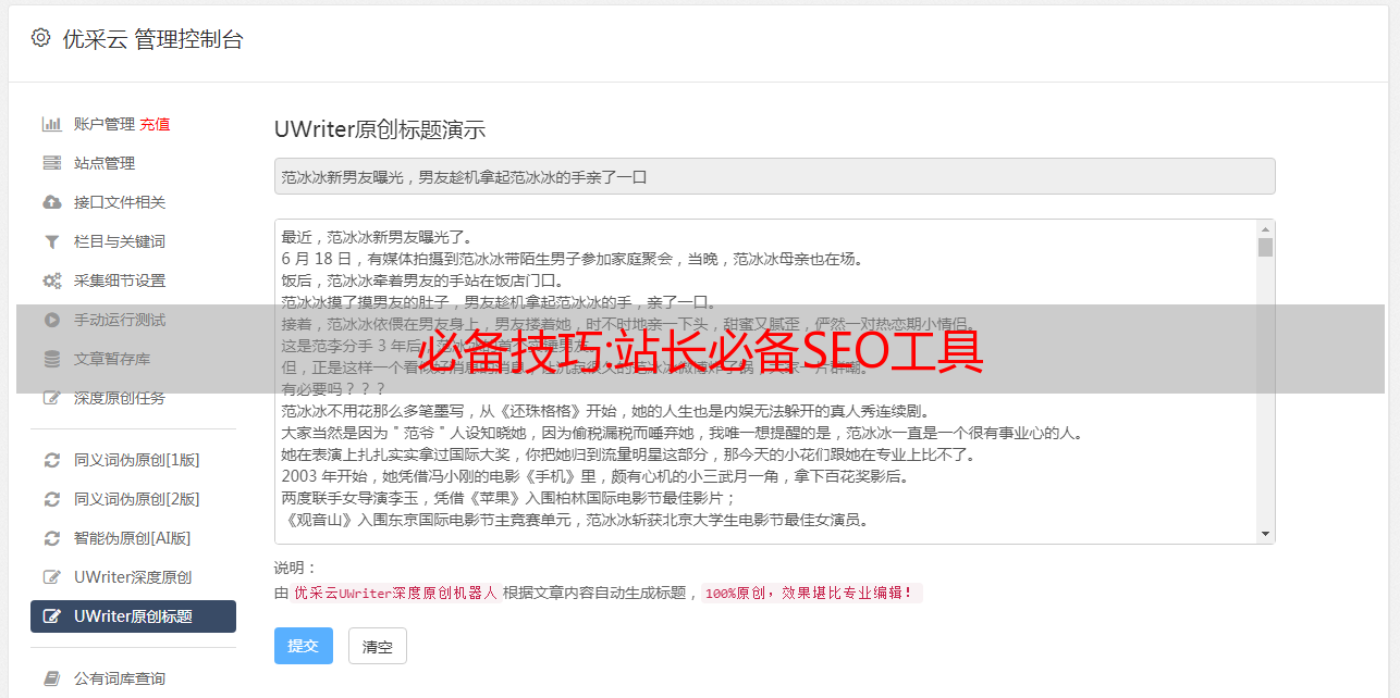 文章定期更新帮助我们网站收录并保持关键词排名,为我们的网站定期更新和tdk相关原创文章 必要的。站长SEO工具有自动文章采集、伪原创发布、网站自动更新、支持多种批量文本处理选项、同义词替换、敏感词删除、自动网站文章 聚合生成目录等,