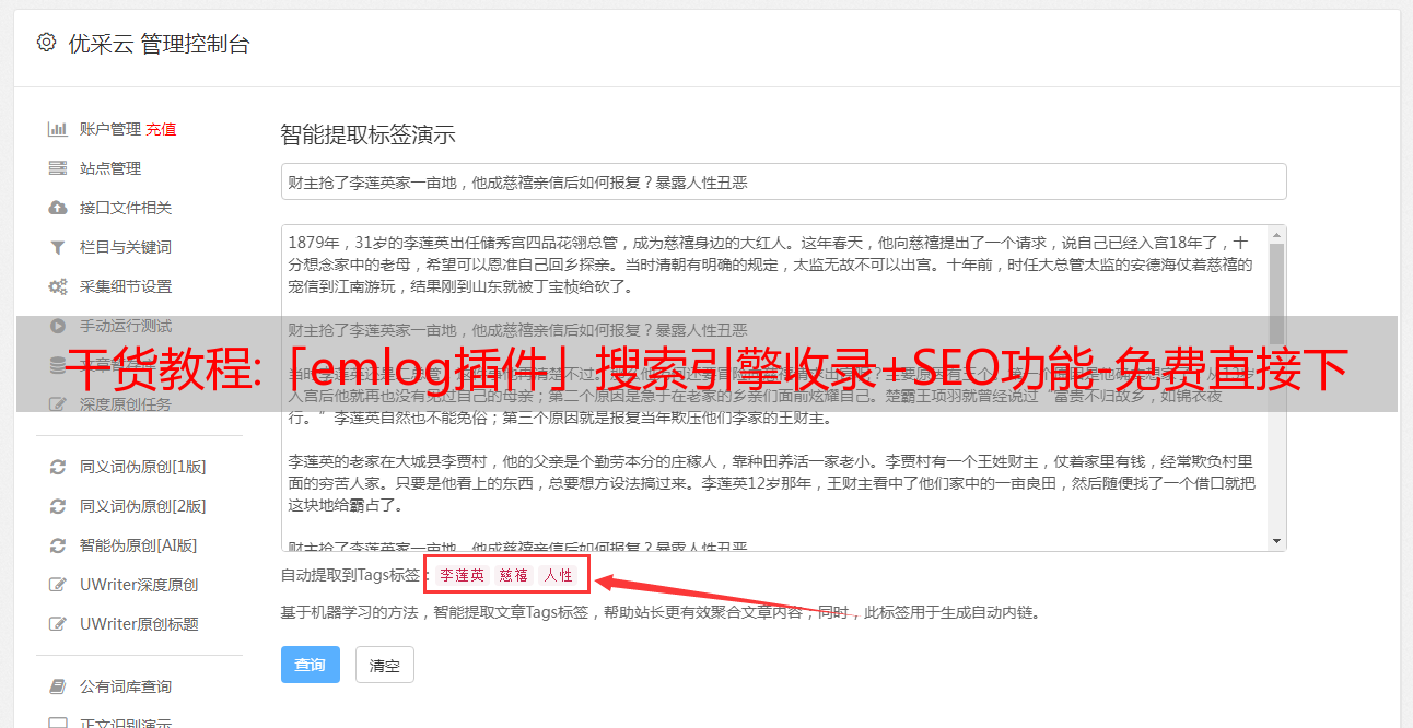 emlog插件?为什么要使用emlog插件?因为emlog插件可以帮助我们快速完成SEO优化,而且emlog插件可以实现今天给大家推荐的emlog插件工具的多个功能集。一键建站+内容资源采集+伪原创+搜索引擎主动推送收录+SEO功能!. emlog 插件仍然可以免费下载和直接使用。稍后我们将以图片的形式向您展示。大家注意看图。