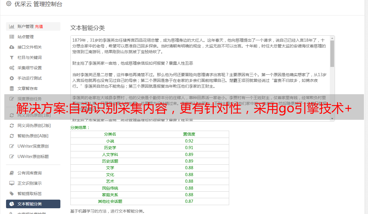 解决方案:自动识别采集内容,更有针对性,采用go引擎技术+程序