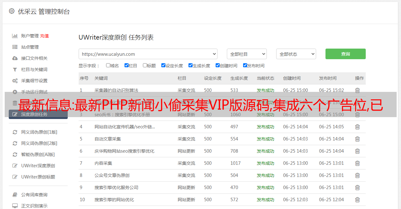 优采云 发布时间: 2022-10-31 10:36最新信息:最新PHP新闻小偷采集VIP版源码,集成六个广告位,已授权不限制域名