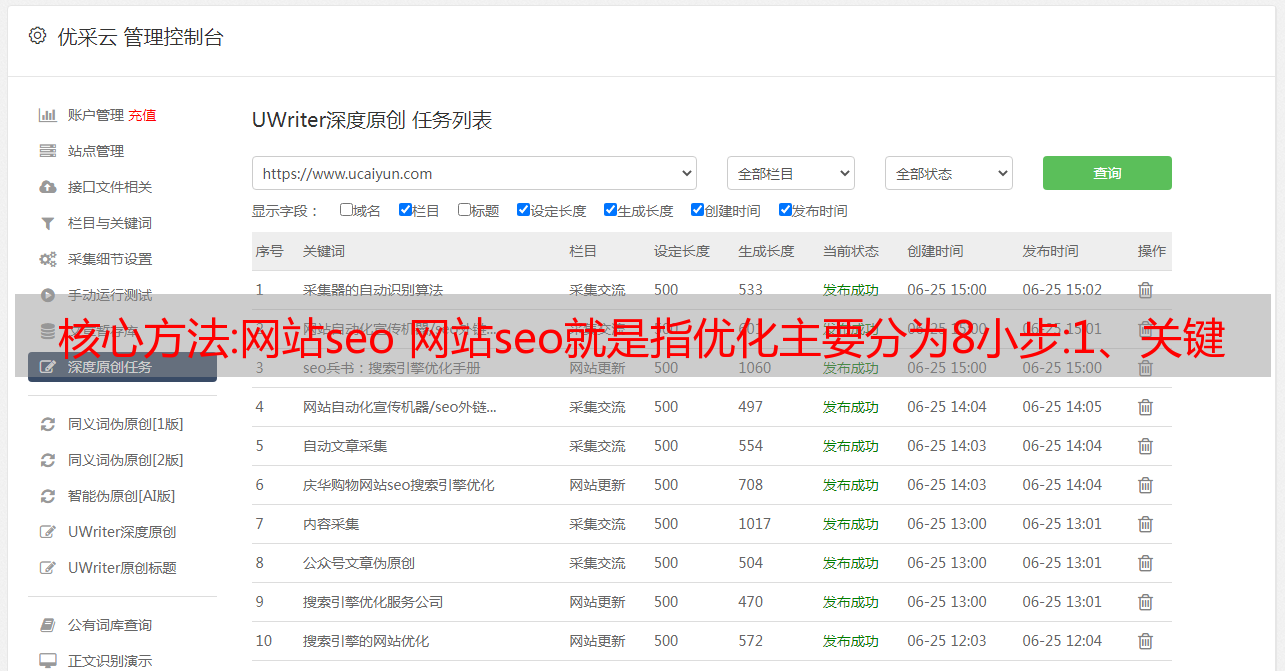 优采云 发布时间: 2022-11-01 00:49核心方法:网站seo 网站seo就是指优化主要分为8小步:1、关键词分析