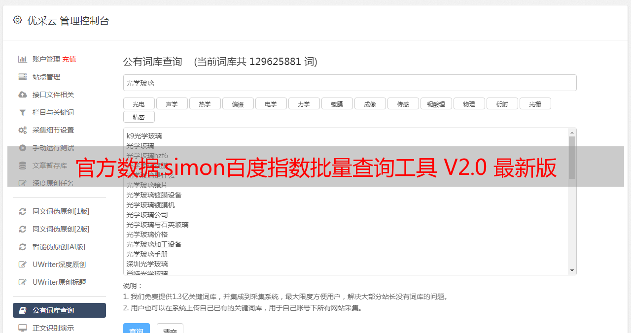 优采云 发布时间: 2022-11-01 09:54官方数据:simon百度指数批量查询工具 V2.0 最新版