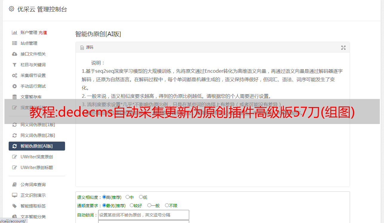 优采云 发布时间: 2022-11-06 18:19教程:dedecms自动采集更新伪原创插件高级版57刀(组图)