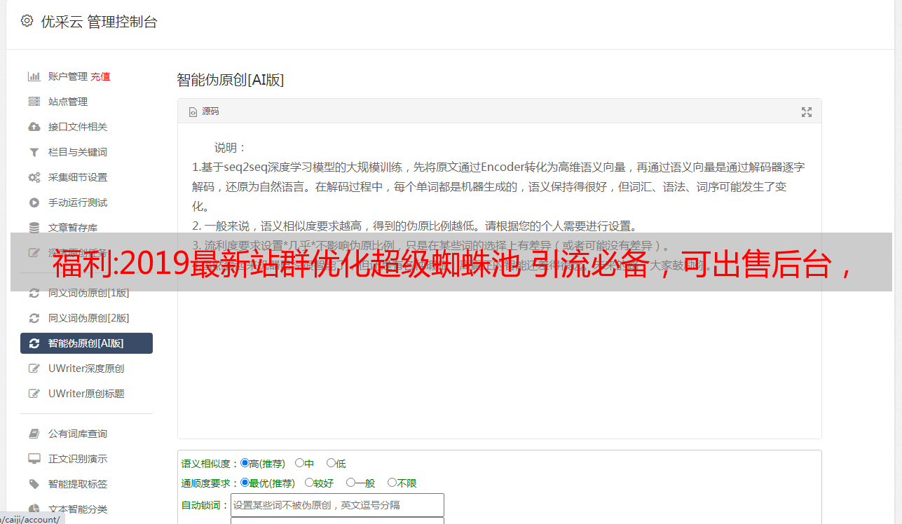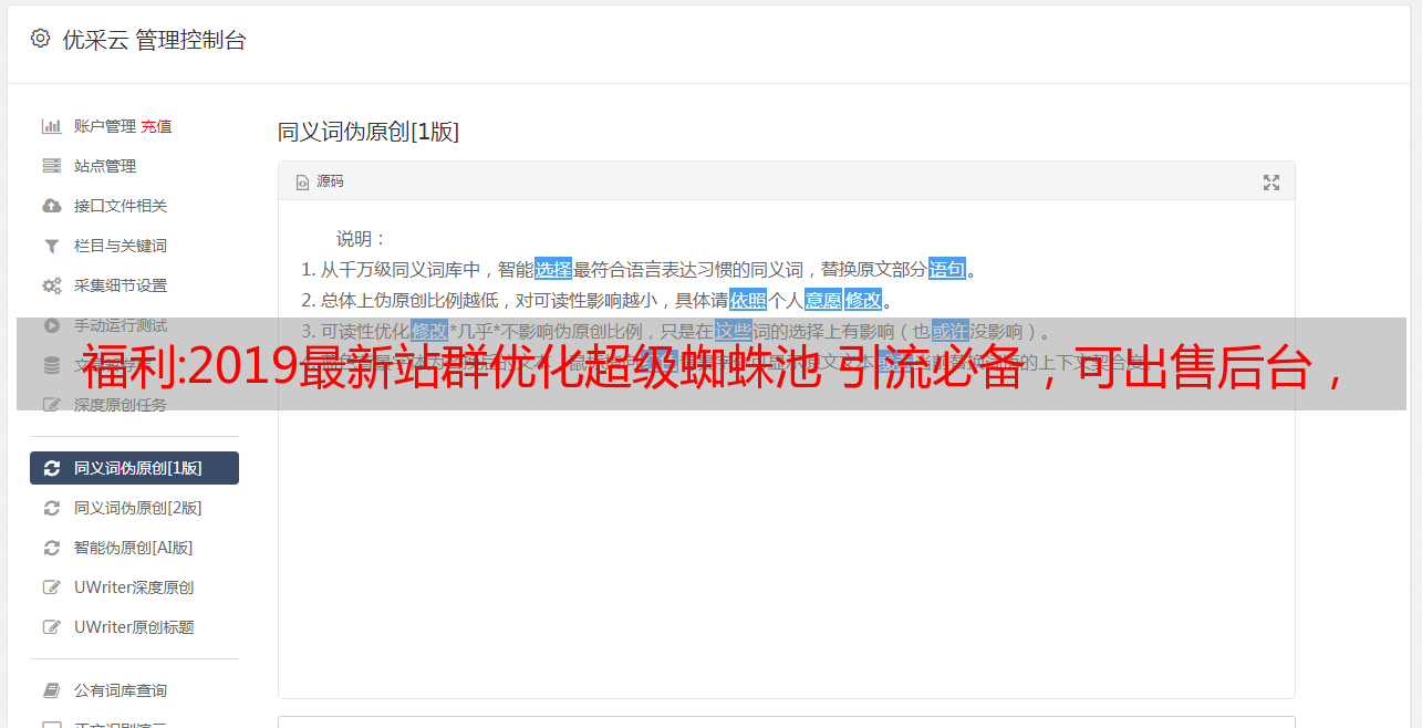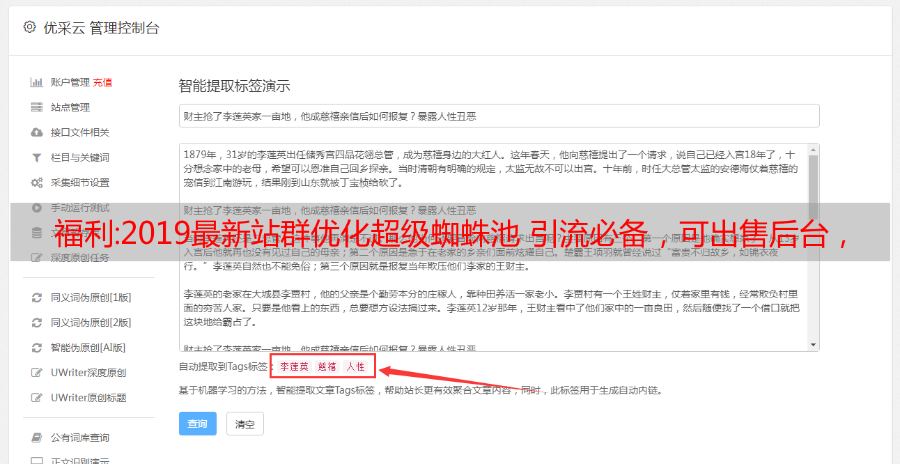 优采云 发布时间: 2022-11-07 00:27福利:2019最新站群优化超级蜘蛛池 引流必备,可出售后台,自动采集,支持外推