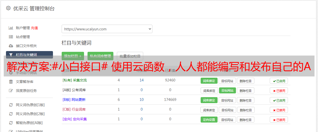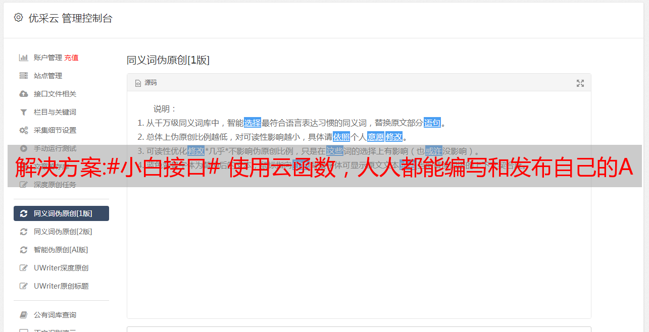优采云 发布时间: 2022-11-07 22:28解决方案:#小白接口# 使用云函数,人人都能编写和发布自己的API接口