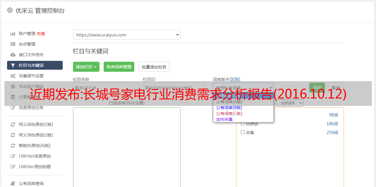 优采云 发布时间: 2022-11-07 23:09近期发布:长城号家电行业消费需求分析报告(2016.10.12)