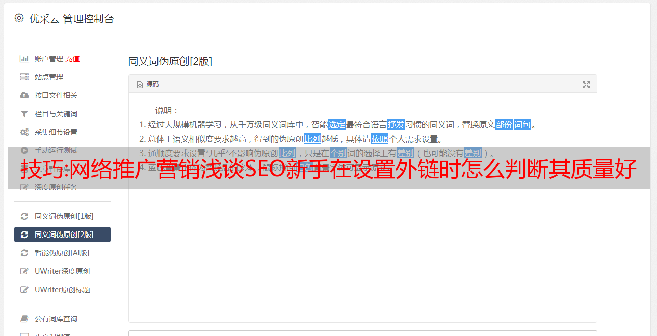 优采云 发布时间: 2022-11-08 03:10技巧:网络推广营销浅谈SEO新手在设置外链时怎么判断其质量好坏?