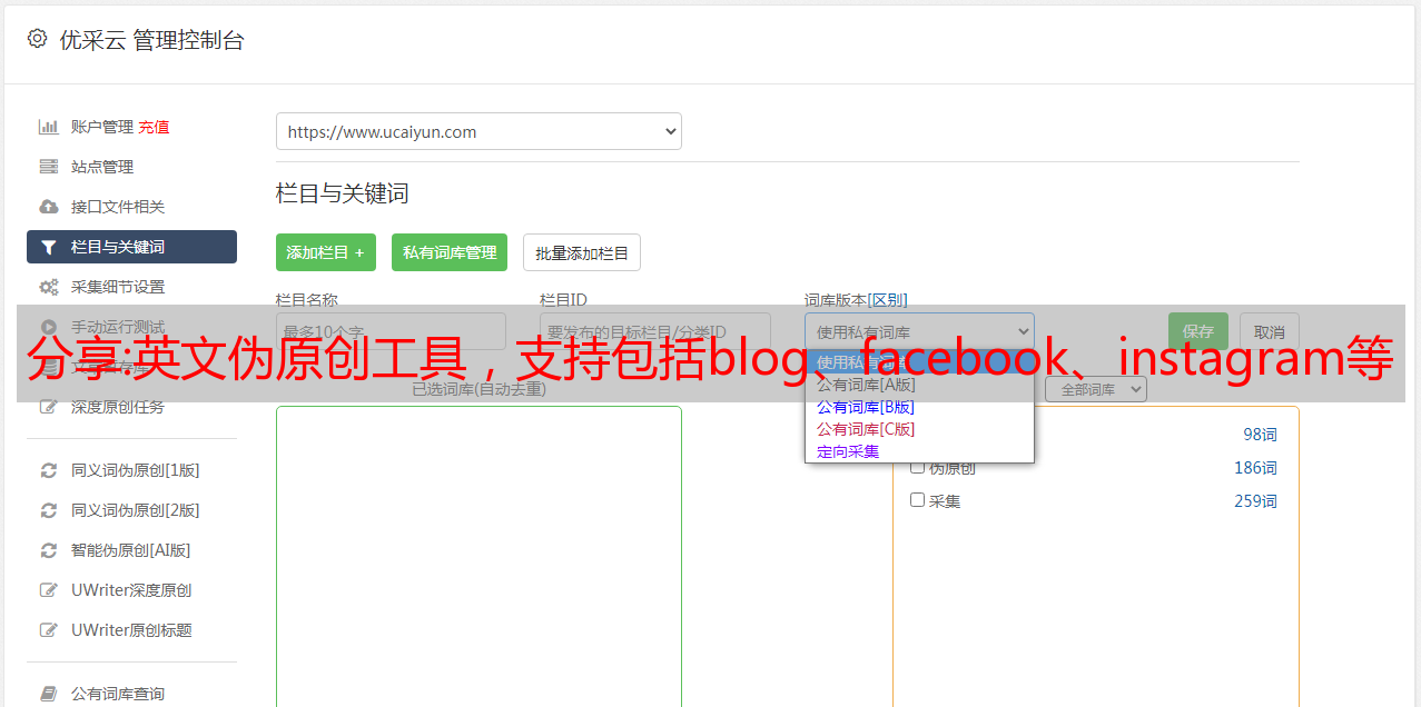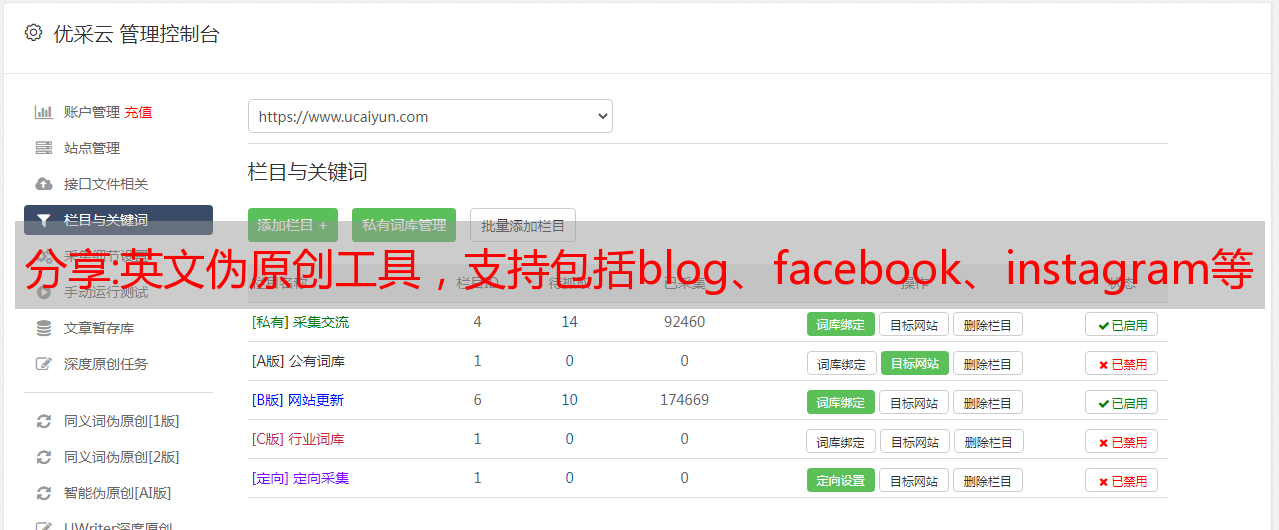 优采云 发布时间: 2022-11-08 17:16分享:英文伪原创工具,支持包括blog、facebook、instagram等