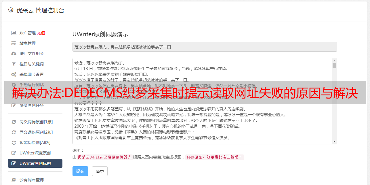 优采云 发布时间: 2022-11-09 12:45解决办法:DEDECMS织梦采集时提示读取网址失败的原因与解决方法