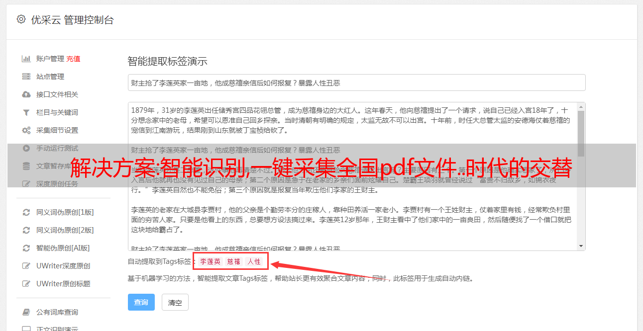 优采云 发布时间: 2022-11-09 22:15解决方案:智能识别,一键采集全国pdf文件..时代的交替