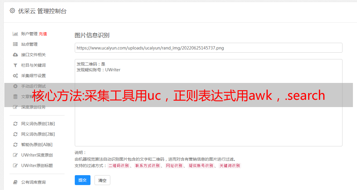 核心方法:采集工具用uc,正则表达式用awk,.search