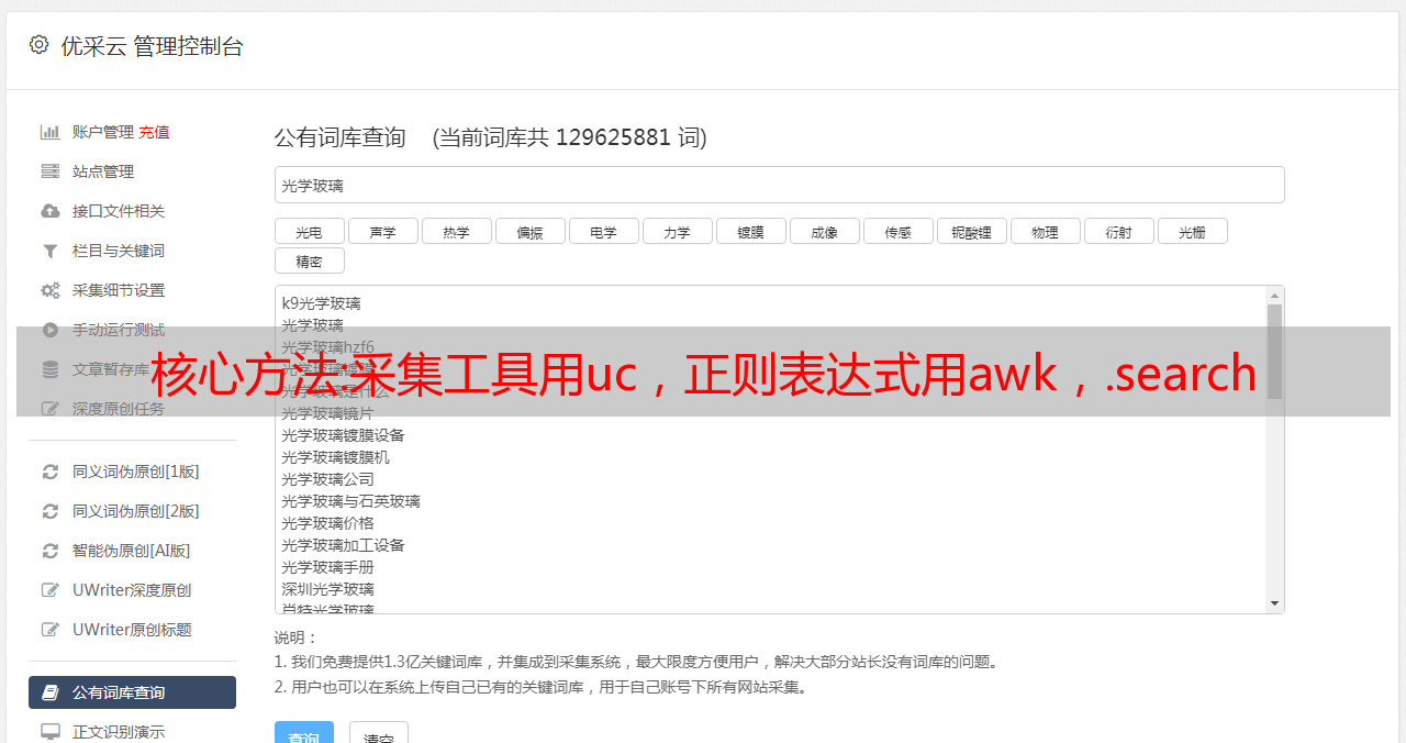 优采云 发布时间: 2022-11-11 20:40核心方法:采集工具用uc,正则表达式用awk,.search