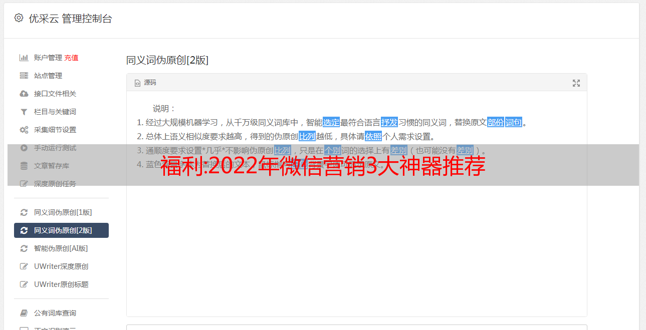 虽然是好东西,但还是建议你付费,因为免费的非常有限。例如敏感词过滤功能和全文重写功能,必须付费使用。建议如果你的需求不是特别大,可以买一个月25元。没关系,就是浪费钱。