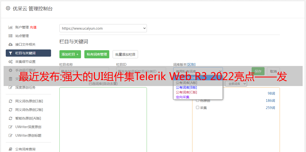 优采云 发布时间: 2022-11-15 14:33最近发布:强大的UI组件集Telerik Web R3 2022亮点——发布全新主题、支持
